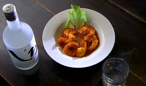 続いて。厨房で料理人の富人代表が『海老チリ』を仕上げてくれました。中原さんは『しろ』お湯割をおかわり!