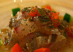メインの選べる魚介料理、今回は厚地さんオススメの『イサキのカルパッチョ」を。
